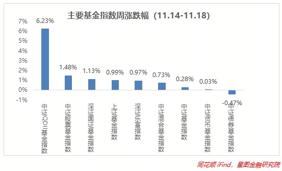 上周基金表现环比改善,受益于港股大涨,所以QDII基金再次领涨,且涨幅大幅扩大,涨超6%,环比+4pct左右,深系基金指数同样由跌转涨,环比均+1pct以上;国内A股市场表现相对较差,所以上证系、中证系涨幅上并不占优,但是环比依旧扩大,均涨超1%左右;债基跌幅较深,主要受权益市场抢占资金、债券利率上行、全市场货币收紧等的影响,上周收跌0.47%;货基变化不大。