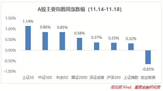 上周A股整体再次震荡上探,涨多跌少,而且大部分指数涨幅都有所扩大,上证50再次领涨,涨超1%,主要受到权重股券商、白酒、银行、地产等反复拉升所致,但是煤炭周内跳水,上证指数、沪深300涨幅受限,都在0.4%以内,而周内专精特新标的政策力度较大,所以科技成长属性的科创板表现居前,达到0.85%,新能源赛道整体回调,创业板表现最差,也是唯一收跌的指数,跌幅达0.65%。其余指数涨幅都在0.3%-0.9%之间。
