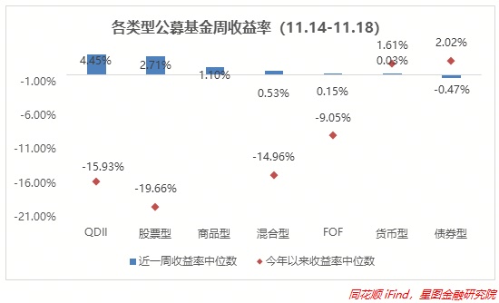 上周QDII型基金收益率中位数最高,主要在于港股、美股表现不错,近一周收益率中枢上抬至4.45%,环比改善也最高,+3.8pct;A股同样收涨,所以带动股票型基金收益率继续上行,涨超2.7%;大宗商品诸如工业金属等表现不错,商品型基金继续走高,涨幅达1.1%.;混合型、FOF型、货币型基金跟涨,不过涨幅不大,都在0%-0.6%之间;债券型基金继续下跌且有所扩大,环比-0.37pct。