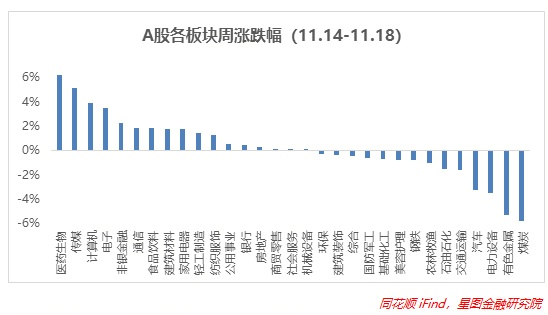 本周A股三大指数集体低开,全天窄幅震荡。截至11月21日收盘,上证指数跌0.39%,在3100点下方震荡,深证成指跌0.41%,创业板指跌0.10%,三大指数盘中一度均跌破1%,在后半段交易时间小幅上涨,成交额接近0.85万亿。盘面上,供销社概念再度走暖,调整半个月的新能源归来,HJT电池、钠离子电池领涨两市,信创板块午后回流,医药下的新冠药、新冠检测继续走强,受疫情困扰的线下消费板块大跌。约有一半的个股上涨,赚钱效应中等偏下。