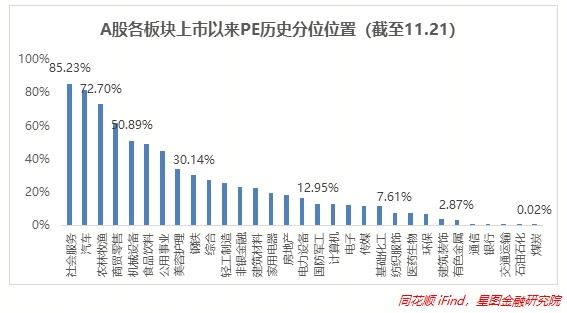 从上市以来板块分位值来看,截至11月21日收盘,8个板块估值实现上修。医药生物受疫情刺激、传媒受世界杯刺激估值修复程度最大,分别+0.92pct、+0.72pct,信创以及安全板块在反复轮动,表现也不差,行业修复力度都在0.2pct-0.5pct内;但是上周表现较好的消费板块受到压制,表现不及预期,美容护理、食品饮料、家电等估值均下滑3pct以上。板块估值中位数为电力设备(16.32%)。