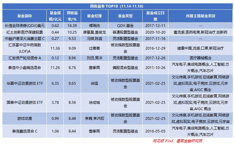 上周基金收益率(A/C基金以A类或排名靠前为准,QDII美元/人民币以排名靠前为准)TOP10中5只是主动权益型基金,剩余包括4只指数型基金、1只QDII型基金。主要在于内地权益市场表现较好,与此同时医疗、文娱、汽车领域在政策面、基本面利好,而美债利率下行使全球债券价格上涨,所以与之相关的QDII基金领涨;但指数实现上涨,所以基金整体收益也小幅回升至-0.25%,环比+0.27pct。从风格上来看,小盘成长型基金领涨。上周长信基金旗下的QDII基金收益最高,达到了16.39%,环比+0.33pct,表现较好,其余基金均在8%以上。